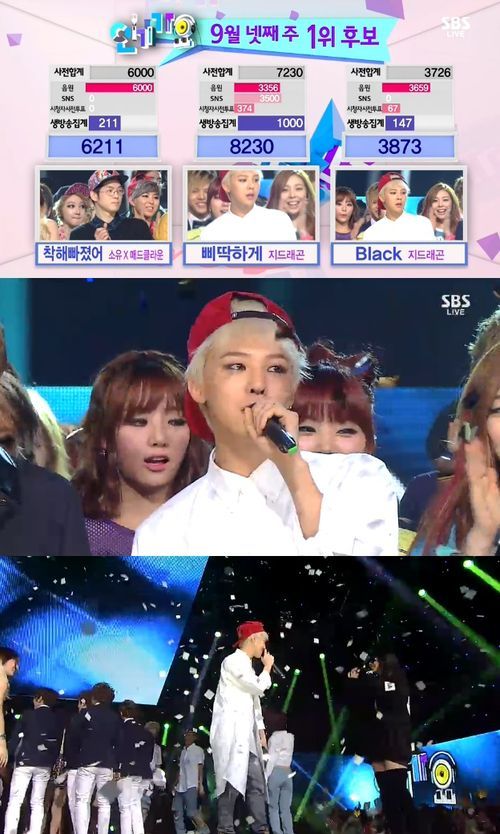 이날도 지난 주에 이어 '인기가요' 1위 후보곡에 지드래곤의 곡이 두 곡이나 올라 눈길을 끌었다. '삐딱하게'와 '블랙'으로 소유와 매드클라운의 '착해 빠졌어'와 1위 대결을 펼쳤다.