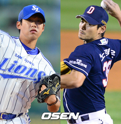 24일 대구구장에서 열리는 '2013 한국시리즈' 1차전 선발투수로 삼성 윤성환(32)과 두산 노경은(29)이 각각 예고됐다. 삼성 류중일 감독 두산 김진욱 감독은 23일 대구실내체육관에서 열린 한국시리즈 미디어 데이에서 두 투수를 1차전 선발로 공식 발표했다.