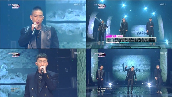 언터쳐블은 8일 오후 방송된 KBS 2TV '뮤직뱅크'에서 네 번째 미니앨범 '트립(TRIP)'의 타이틀곡 '배인(VAIL)'을 열창했다.