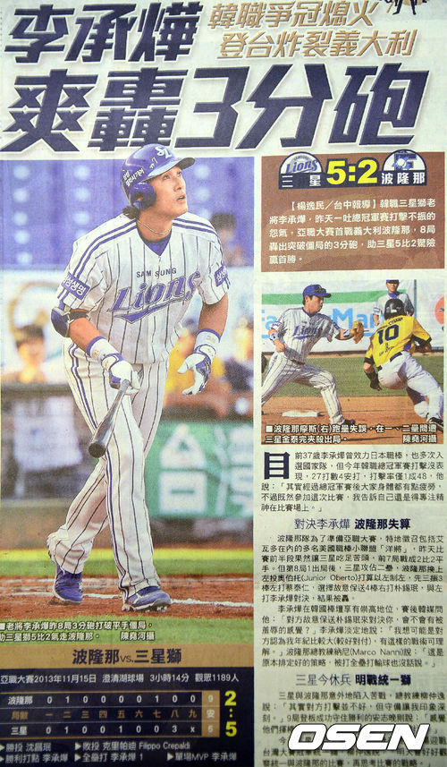 '빈과일보'(애플 포스트) 등 대만 언론들이 이승엽(삼성)의 결승 홈런 가동 소식을 비중있게 보도했다.