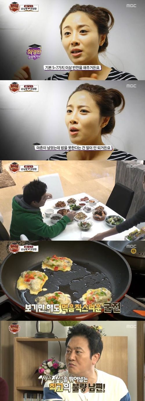 이날 최영완은 아침식사로 7첩반상을 준비했지만, 그의 남편 손남목은 “전이 없다”라고 불만을 털어놨다. 이에 식사 중이던 최영완은 “굴 있는데 굴전 해줄까?”라며 자리에서 일어났지만, 손남목은 “물어보기 전에 미리 해주면 얼마나 좋아”라고 툴툴거렸다.