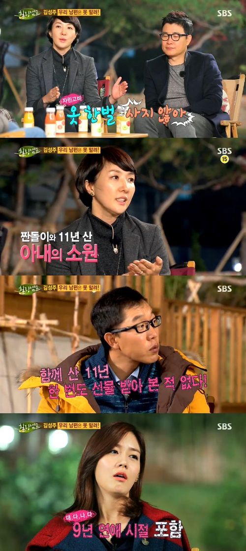 또한 "결혼기념일 때 단둘이 외식을 하는데 선물을 주고받지 않는다. 3년 전 도둑을 맞아 패물이 없다. 10주년 때 시계를 하자고 했는데 휴대전화 (시계) 보라고 하더라"라며 속상해 했다.