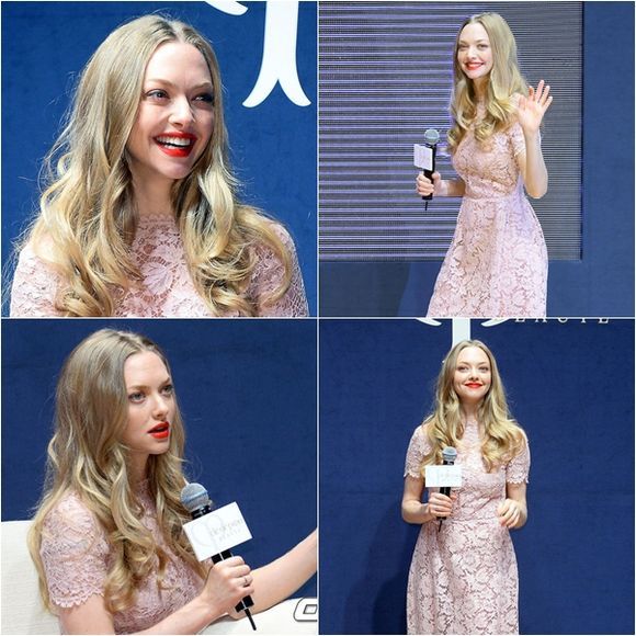 이날 아만다 사이프리드는 여성스런 몸매에 어울리는 하얀색의 원피스를 차려 입고 금발과 붉은 입술을 빛내며 기자회견 석상에 참석했다.