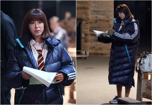 2일 공개된 OCN 드라마 '처용' 촬영장 스틸컷에서 전효성은 두터운 롱 패딩 점퍼를 입은 채 촬영 대기중인 모습으로 손에 대본을 꼭 쥐고 연습하고 읽고를 반복 중이다.