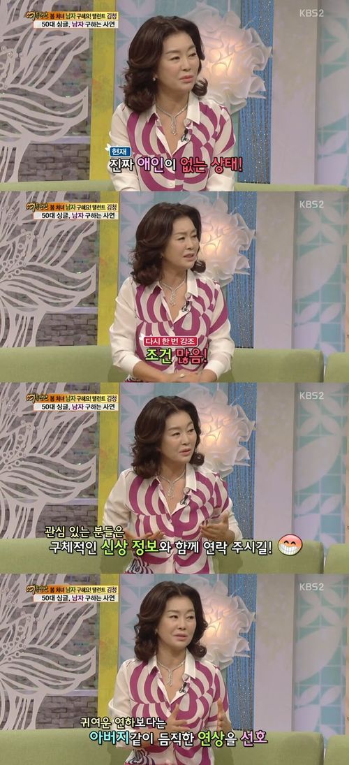 이어 김청은 “구체적인 신상정보를 적어서 연락을 달라”며 “귀여운 연하보다는 듬직한 연상의 아버지 같은 스타일이 좋다. 아버지가 없어서 그런지 아버지에 대한 동경이 있다”고 이상형을 밝혔다.