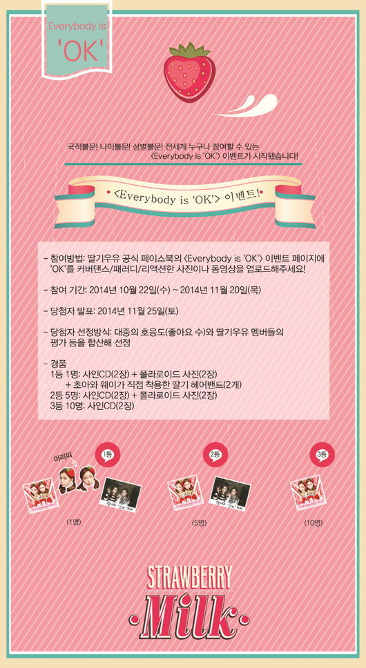 ‘에브리바디 이즈 오케이(Everybody is 'OK')’라는 타이틀의 이번 이벤트는 성별, 연령 제한 없이 전세계 누구나 참여 가능하며 딸기우유의 데뷔 타이틀곡 ‘OK’를 커버댄스하거나 패러디 혹은 리액션한 사진이나 동영상을 딸기우유 공식 페이스북 이벤트 페이지에 게재하면 된다.