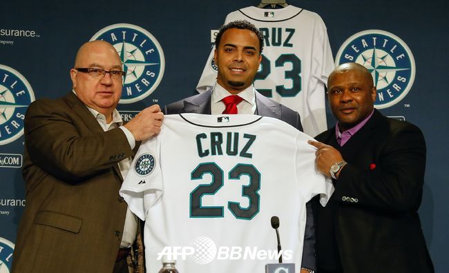 시애틀과 계약 후 잭 주렌식 단장(좌측), 로이드 매클렌든 감독(우측)과 저지를 들어 보이고 있는 넬슨 크루스. ⓒAFPBBNews = News1(무단전재 및 재배포 금지)