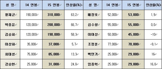 황재균 선수는 전년대비 63.2% 인상된 3억1천 만원에 계약을 체결했다. 또한, 박종윤 선수는 전년대비 66.7% 인상된 2억원에, 김승회 선수는 58.3% 인상된 1억9천 만원에 계약을 완료했다.