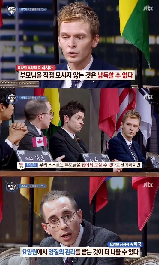 이에 미국 대표 타일러는 "우리가 봤을 때는 부모님을 집에서 모실 수 있을까 과연 그게 맞을까라는 생각을 한다. 집에 좋은 시설을 갖추지 못하고 있다. 요양원에서 양질의 관리를 받는 것이 낫다"고 반박했다.