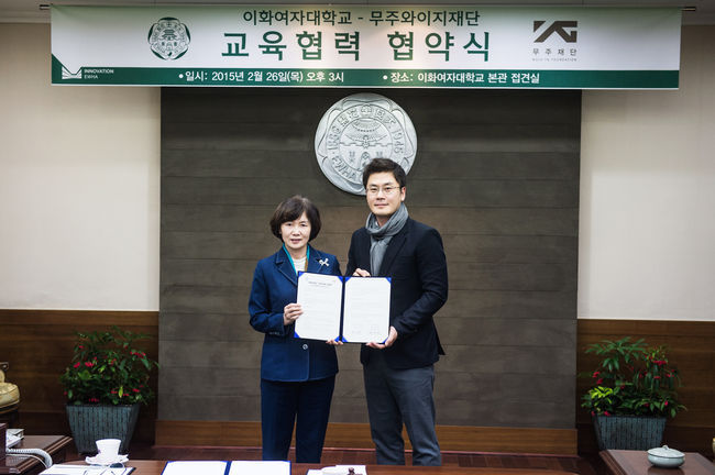 YG가 지난해 5월 설립한 비영리재단인 '무주YG재단'과 이화여대는 26일 오후 3시 이화여대 본관에서 학교 폭력 피해·가해 학생, 학교 제도권 밖의 위기청소년을 대상으로 음악심리치료 및 음악정서지원사업을 위한 교육협력 협약식을 가졌다.