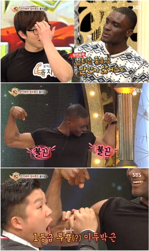 이날 남다른 팔 힘을 지닌 홍지승씨가 출연해 '스타킹' 패널들과의 팔씨름 대결에 나섰다. 첫 번째 주자는 샘 오취리였다. 홍씨는 "자신의 팔을 1cm만 움직여도 진 것으로 하겠다"고 제안했고, 이에 샘 오취리는 "컨디션이 좋을 땐 나도 만만치 않다"고 응수했다. 이어 샘 오취리는 겉옷을 벗으며 잘 다듬어진 팔 근육을 뽐냈다. 하지만 그럼에도 팔씨름은 홍씨가 승리했다.