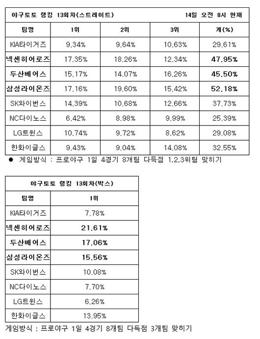 한편, 순위에 상관없이 다득점 3개팀만을 맞히는 ‘박스’ 게임에서는 넥센(21.61%)이 1순위를 차지한 가운데, 두산(17.06%)과 삼성(15.56%)이 뒤를 이었다.