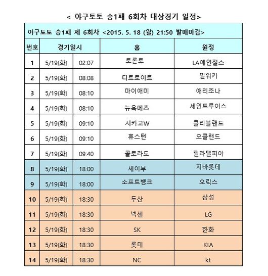 국민체육진흥공단(www.kspo.or.kr)이 발행하는 체육진흥투표권 수탁사업자인 스포츠토토(www.sportstoto.co.kr)는 오는 19일(화)에 벌어지는 국내 프로야구(KBO) 5경기 및 미국프로야구(MLB) 7경기, 일본프로야구(NPB) 등 총 14경기를 대상으로 한 야구토토 승1패 6회차 게임을 발행한다고 밝혔다.