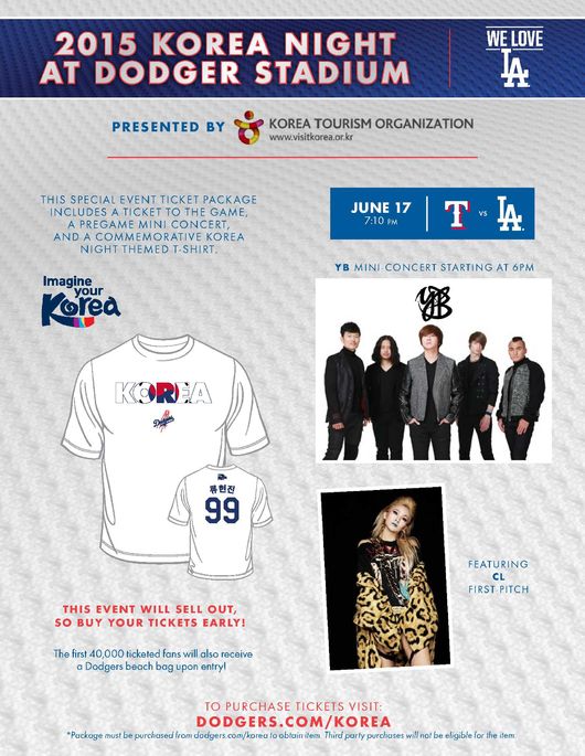 [OSEN=다저스타디움(LA 미국 캘리포니아주), 박승현 특파원]가수 씨엘이 오는 6월 18일 다저스타디움에서 LA 다저스와 텍사스 레인저스전에 앞서 열리는 한국의 날 행사에서 미국 국가를 부르고 시구를 한다. 록 밴드 YB는 이날 미니 콘서트도 진행한다. 미니 콘서트는 경기 시작 한 시간 전에 시작한다.