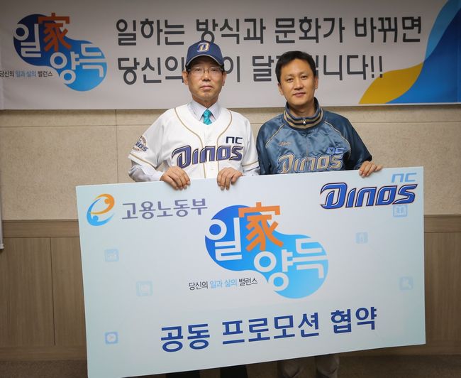 NC 다이노스와 고용노동부 창원지청이 21일 창원 마산야구장에서 일과 가정이 행복한 균형을 이룰 수 있도록 우리의 일하는 방식에 대한 인식과 문화를 개선하자는 의미를 담은 ‘일가(家)양득’ 캠페인을 위한 협약식을 진행했다.