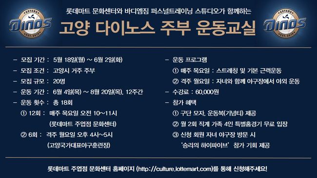 다음달 4일 부터 8월 셋째주까지 매주 목요일 오전 10시 롯데마트 주엽점 문화센터에서 ‘바디엠짐 퍼스널트레이닝 스튜디오’의 전문 트레이너의 지도로 스트레칭과 기본 근력운동을 배우게 된다. 6월8일 이후 격주 월요일 오후 4시에는 고양시 대화역 근처 고양야구장에서 자녀와 함께 운동하는 기회도 갖는다.