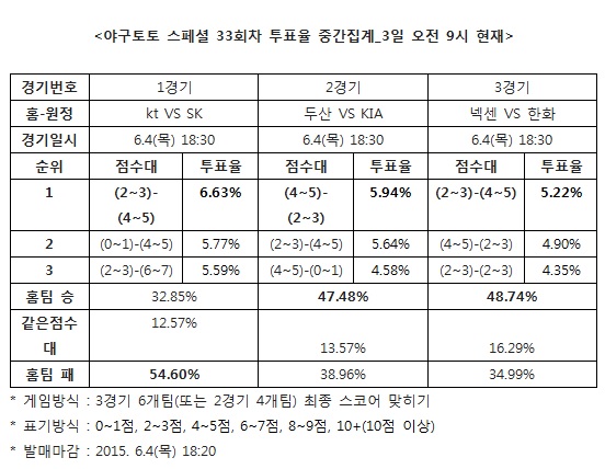 [야구토토] 국민체육진흥공단(www.kspo.or.kr)이 발행하는 체육진흥투표권 공식 온라인 발매 사이트 베트맨(www.betman.co.kr)이 4일에 열리는 2015시즌 한국프로야구(KBO) 3경기를 대상으로 한 야구토토 스페셜 33회차 투표율을 중간 집계한 결과, 참가자의 54.60%는 kt-SK(1경기)전에서 SK가 kt에 승리할 것이라 예상했다.