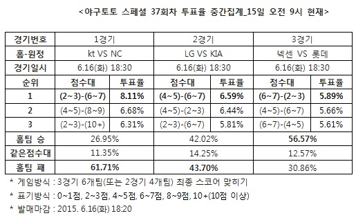 [야구토토] 국민체육진흥공단(www.kspo.or.kr)이 발행하는 체육진흥투표권 공식 온라인 발매 사이트 베트맨(www.betman.co.kr)이 오는 16일에 열리는 2015시즌 한국프로야구(KBO) 3경기를 대상으로 한 야구토토 스페셜 37회차 투표율을 중간 집계한 결과, 참가자의 61.71%는 kt-NC(1경기)전에서 NC가 kt에 승리할 것이라 예상했다.