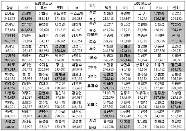 한편 이번 올스타 팬 투표는 역대 최다 투표수를 기록한 2013년 2차 집계(137만7393표) 대비 약 12.3% 증가한 수치로 올스타전에 대한 팬들의 관심이 지속적으로 이어지고 있으며 내달 3일까지 2주간 더 진행되는 최종 집계에서 역대 최다 투표수(2013년 221만7846표) 경신도 가능할 것으로 예상된다.
