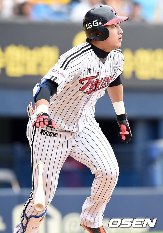 2회말 LG 공격 선두타자로 나선 서상우가 우전안타를 날리고 있다.