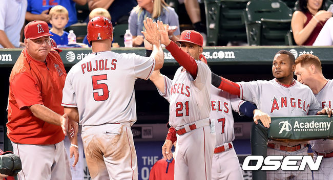 2회초 1사 1,3루 에인절스 푸홀스가 빅토리노의 좌익수 희생플라이때 득점을 올린 뒤 기뻐하고 있다.