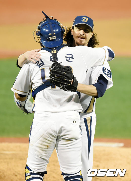 경기 종료 후 NC 승리투수 스튜어트가 김태군과 포옹을 하고 있다./rumi@osen.co.kr