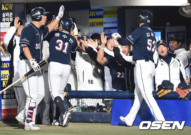 26일 오후 대구구장서 열리는 ‘2015 타이어뱅크 KBO 리그’ 삼성 라이온즈와 두산 베어스의 한국시리즈 1차전, 2회초 1사 2,3루 허경민이 2타점 적시타때 홈을 밟은 정수빈 김재호가 동료들의 환영을 받고 있다.