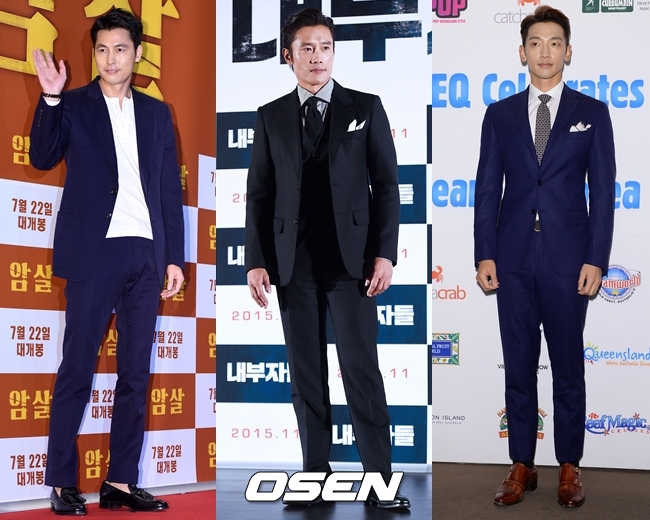 지난해 방송한 드라마 ‘내겐 너무 사랑스러운 그녀’ 이후 국내 활동이 뜸한 가수 겸 배우 비(정지훈)도 슈트 자태와 액션으로는 빼놓을 수 없다. 185cm의 장신에 근육으로 이뤄져 마르지만은 않은 몸이 큰 매력 포인트다. 여전히 영화 ‘닌자 어쌔신’ 속 컴퓨터 그래픽 같은 탄탄한 몸을 기억하는 관객이 많다. 액션 연기도 할리우드와 중국 대륙의 마음을 사로잡았다. 특히 할리우드 영화 ‘더 프린스’ 속 슈트 자태는 제임스 본드를 떠올리기에 충분하다.