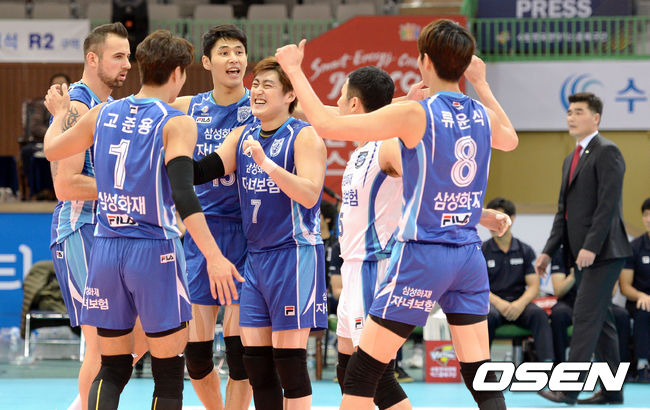 2세트 삼성화재 선수들이 득점 후 환호하고 있다.