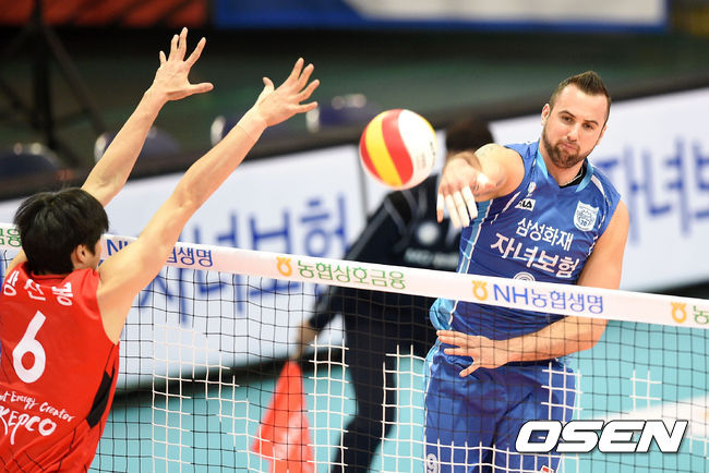 1세트 삼성화재 그로저가 한국전력의 블로킹 벽을 피해 공격을 시도하고 있다.