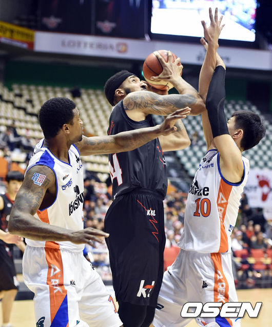 1쿼터 부산 KT 심스가 전자랜드 정효근과 포웰의 합동 수비에 고전하고 있다.