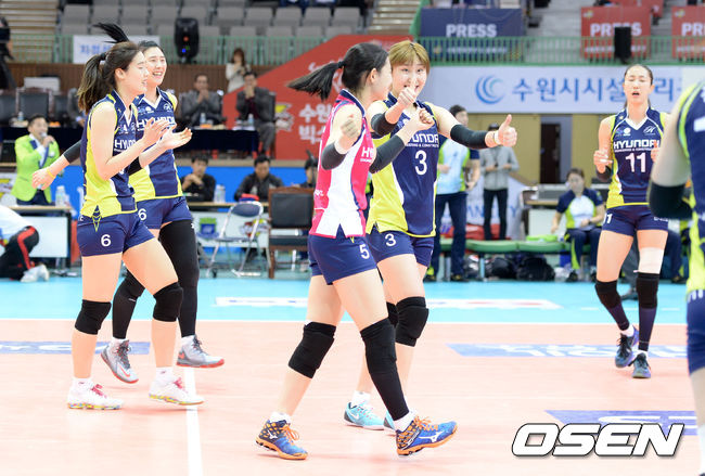 경기 종료 후 현대건설 선수들이 승리의 기쁨을 나누고 있다./sunday@osen.co.kr
