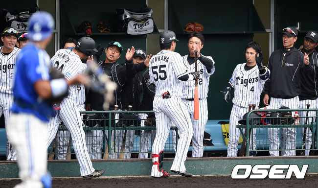 2회말 2사 1루에서 한신 요카와가 투런 홈런을 치고 더그아웃에서 환호하고 있다.