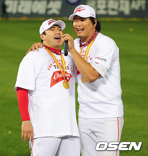 [사진] 2009년 한국시리즈 우승 후 서재응과 최희섭.