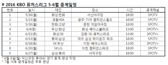 한편 기존 편성된 퓨처스리그 토요일 경기 중 6월 4일 두산-화성(화성 베이스볼파크), 11일 화성-SK(강화퓨처스파크), 18일 SK-두산(이천 베어스파크) 등 3경기는 13:00부터 SPOTV 플러스를 통해 생중계된다.