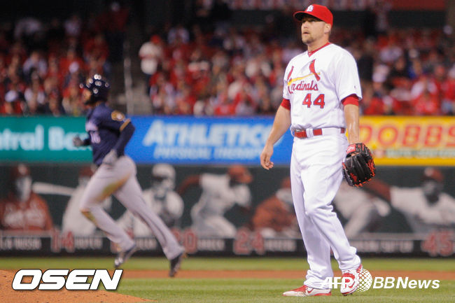 1-2로 뒤진 9회초, 세인트루이스는 마무리 투수 트레버 로젠탈을 마운드에 올리며 포기하지 않았다. 그러나 로젠탈은 안타 2개와 볼넷 1개로 1사 만루 위기를 자초한 뒤 카를로스 고메즈에 2타점 적시타를 터뜨리며 로젠탈을 무너뜨렸다. 세인트루이스는 기울어진 승부를 뒤집지 못하고 2연패에 빠졌다. /jhrae@osen.co.kr