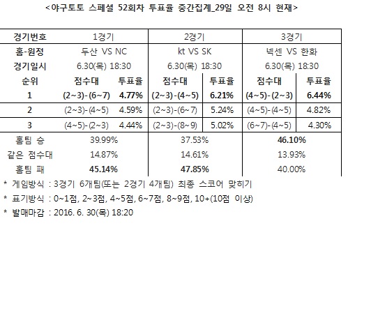 한편, 주중에 벌어지는 국내프로야구 3경기를 대상으로 하는 야구토토 스페셜 52회차 게임은 오는 30일 오후 6시 20분에 발매가 마감되며, 경기가 모두 종료된 이후에 적중결과가 공식 발표된다.