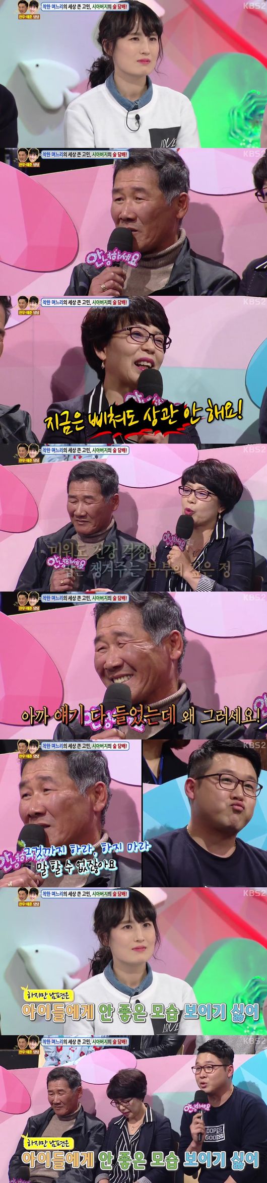 며느리는 "친정아빠가 시아버지처럼 술, 담배를 많이 했는데 59세 때 심장마미로 돌아가셨다. 스무살이었는데 시아버지를 볼 때마다 친정아빠 모습이 보인다. 본인은 괜찮다고 하지만 갑자기 저희 곁을 떠나실까봐 걱정이다"고 했다.