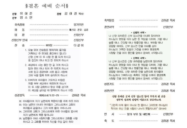 “나 신랑 유하준은 신부 양소연을 아내로 맞이하여 하나님의 명령을 따라 남편 된 책임을 다하여 기쁠 때나 슬플 때나 건강할 때나 병들었을 때나 부유할 때나 궁핍할 때에도 신부 임소연만을 아내로 삼아 하나님의 거룩한 믿음의 가정을 이루어 평생토록 사랑할 것을 여러 증인들 앞에서 엄숙히 서약합니다”라는 성혼선언문이 눈길을 끈다.