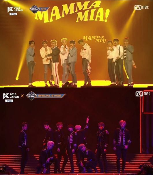 19일 오후 방송된 엠넷 ‘KCON 2018 JAPAN’에서는 SF9의 ‘맘마미아(MAMMA MIA)’ 무대가 전파를 탔다. 지난 1월 일본 팬클럽 발족식 이후 약 3개월여 만에 일본을 다시 찾은 SF9은 ‘KCON 2018 JAPAN’에서 ‘맘마미아’와 ‘오솔레미오(O Sole Mio)’ 등 상반되는 분위기의 두 무대를 펼치며 발랄한 하이틴 뮤지컬 퍼포먼스와 섹시한 라틴팝의 반전 매력을 선보였다. 특히 이들은 5월 일본 싱글 ‘맘마미아!’ 발매에 앞서 한국어 버전으로 현지에서 첫 선을 보여 신곡 무대를 기다린 일본 팬들의 열광적인 호응을 얻었다.