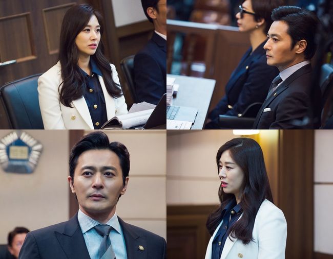 사진 속 장동건 장신영은 같은 법정에 있다. 다만 나란히 함께 있는 것이 아니라 각자 의뢰인 곁에, 서로에게 칼을 겨눠야 하는 상대편에 서 있다. 흔들림 없는 눈빛과 표정으로 변론하고 있는 장신영, 역시 최대한 감정을 드러내지 않은 채 변론 중인 장동건. 두 사람 모두 한 치의 흐트러짐 없이 팽팽한 긴장감을 유지하며 상대를 견제하고 있다.