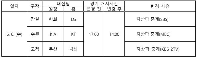 현충일(6일)에 열리는 잠실(SBS), 수원(MBC), 고척(KBS 2TV) 경기는 지상파 TV 중계로 인한 방송사의 요청으로 오후 5시에서 2시로 앞당겨졌다. 나머지 문학(삼성-SK), 마산(롯데-NC) 경기는 오후 5시 원래 시간에 시작된다.