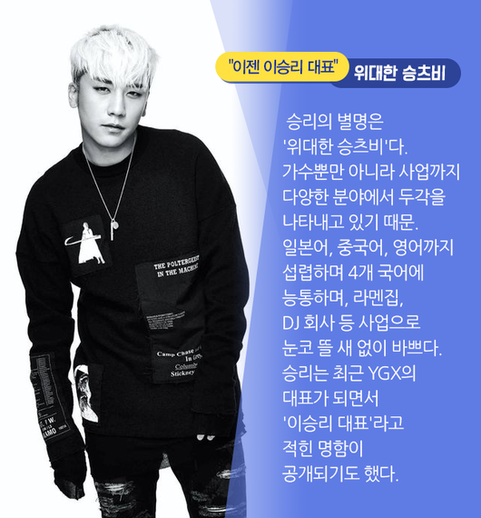 승리의 별명은 '위대한 승츠비'다. 가수뿐만 아니라 사업까지 다양한 분야에서 두각을 나타내고 있기 때문. 일본어, 중국어, 영어까지 섭렵하며 4개 국어에 능통하며, 라멘집, DJ 회사 등 사업으로 눈코 뜰 새 없이 바쁘다. 승리는 최근 YGX의 대표가 되면서 '이승리 대표'라고 적힌 명함이 공개되기도 했다.