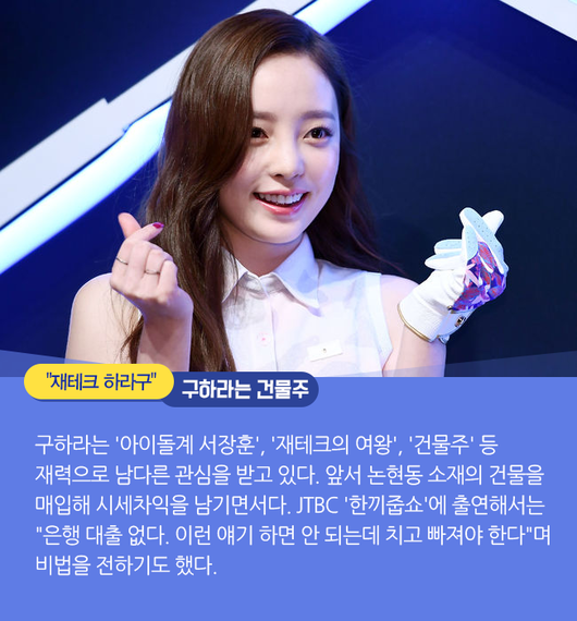 구하라는 '아이돌계 서장훈', '재테크의 여왕', '건물주' 등 재력으로 남다른 관심을 받고 있다. 앞서 논현동 소재의 건물을 매입해 시세차익을 남기면서다. JTBC '한끼줍쇼'에 출연해서는 "은행 대출 없다. 이런 얘기 하면 안 되는데 치고 빠져야 한다"며 비법을 전하기도 했다.