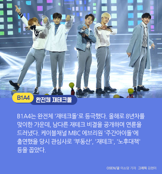 B1A4는 완전체 '재테크돌'로 등극했다. 올해로 8년차를 맞이한 가운데, 남다른 재테크 비결을 공개하며 연륜을 드러냈다. 케이블채널 MBC 에브리원 '주간아이돌'에 출연했을 당시 관심사로 '부동산', '재테크', '노후대책' 등을 꼽았다. / besodam@osen.co.kr