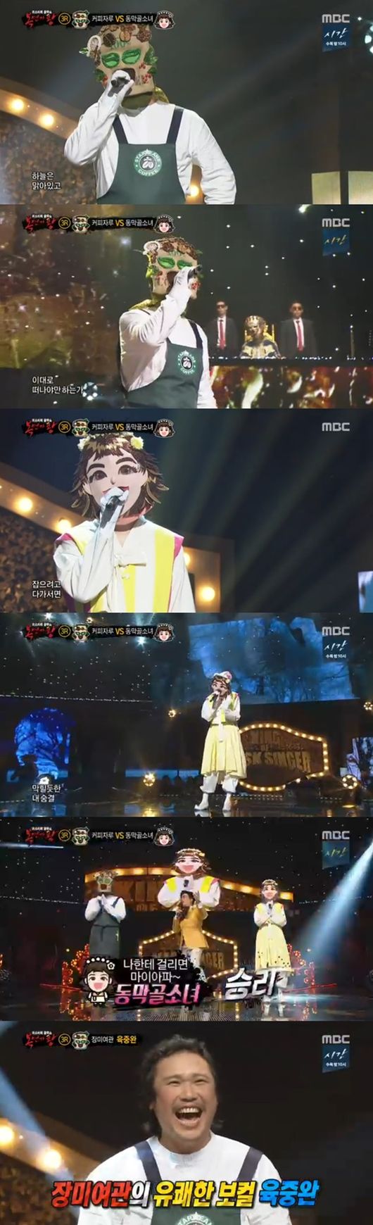 연예인 판정단은 두 복면가수의 승패를 쉽게 예측하지 못했다. 결국 마지막 가왕 결정전에 진출한 인물은 동막골소녀였다. 무려 80대 19 차였다. 커피자루의 정체는 김구라의 예측 대로 장미여관 육중완이었다. / yjh0304@osen.co.kr