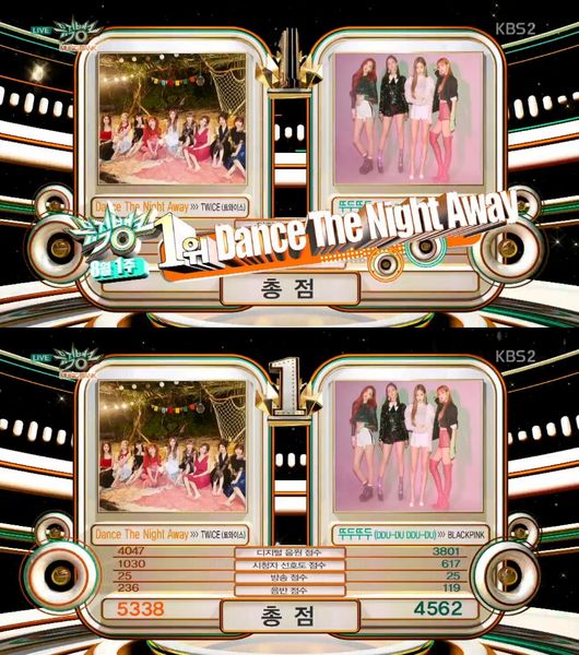 3일 오후 생방송된 KBS2 음악방송 ‘뮤직뱅크’에서 트와이스와 블랙핑크가 1위 트로피를 놓고 대결을 펼친 결과, 트와이스가 왕좌를 차지했다. 이로써 7관왕을 기록한 셈이다.