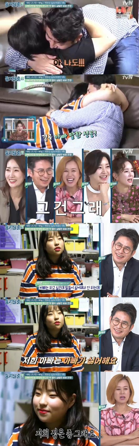 진이는 "이래서 내가 아빠를 존경한다"면서 급 포옹을 했고, 민이가 달려들어 父에게 또 입맞춤했다. 아빠의 사랑을 독차지 하고픈 딸들의 애교전쟁이었다. 민이는 "다른 집은 딸들이 싫어한다는데 우리집은 아빠가 싫어한다"고 말해 웃음을 안겼다. 이어 민이는 윗몸일으키기를 하자고 제안, 아빠를 쥐락펴락했다. 반대로 父도 민이와 진이를 시켰다. 하지만 두 딸모두 윗몸 일으키기에 실패했다. 딸들의 건강이 걱정된 박종진은 깜짝 놀랐다.