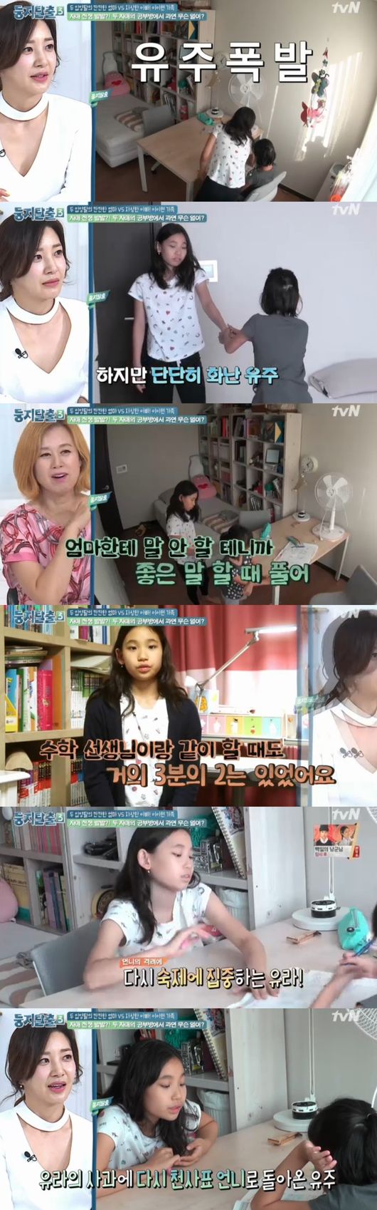 유주를 향한 열혈부부의 질문공세가 이어졌다. 갑작스러운 숙제공격까지 딸들을 당황시켰다. 수학을 잘하는 유라가 유주를 직접 가르쳤다. 언니도움으로 유라는 막힘없이 문제를 풀어나갔다. 하지만 그것도 잠시, 집중력이 약한 유라가 장난을 치자, 유주 화가 폭발했다. 유라는 언니 눈치를 살피더니 미안하다고 했다. 유주는 차근히 다시 동생을 가르치며 칭찬과 격려를 아끼지 않았다. 훌륭한 유주의 동생다루는 모습에 모두 감탄했다.