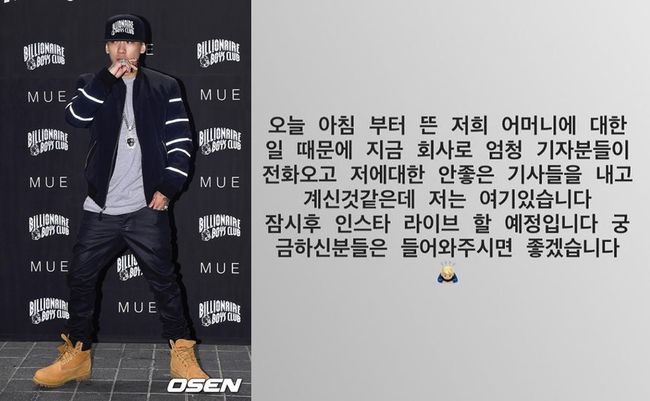 도끼는 26일 자신의 인스타그램에 "오늘 아침부터 뜬 어머니에 대한 일 때문에 회사로 엄청 기자분들이 전화 오고, 나에 대한 안 좋은 기사들을 내고 있는 것 같은데, 나는 여기 있다. 잠시 후, 인스타 라이브를 할 예정이다. 궁금하신 분들은 들어와 주시면 좋겠다"는 예고 글을 게재했다.